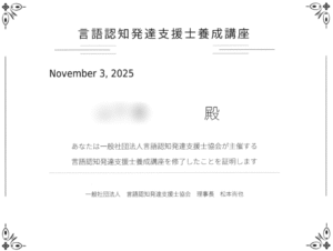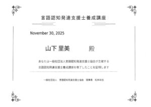 言語認知発達支援士とは、言語と認知の発達に課題のある子どもを、家庭や保育・療育現場などで支援する専門家で、一般社団法人言語認知発達支援士協会が認定する民間資格です。国家資格である言語聴覚士と異なり、医療機関での訓練を専門とするのではなく、より広範な現場で子どもたちの発達をサポートする役割を担います。現在受講中の職員を含め言語認知発達支援士が6名在籍することになります。